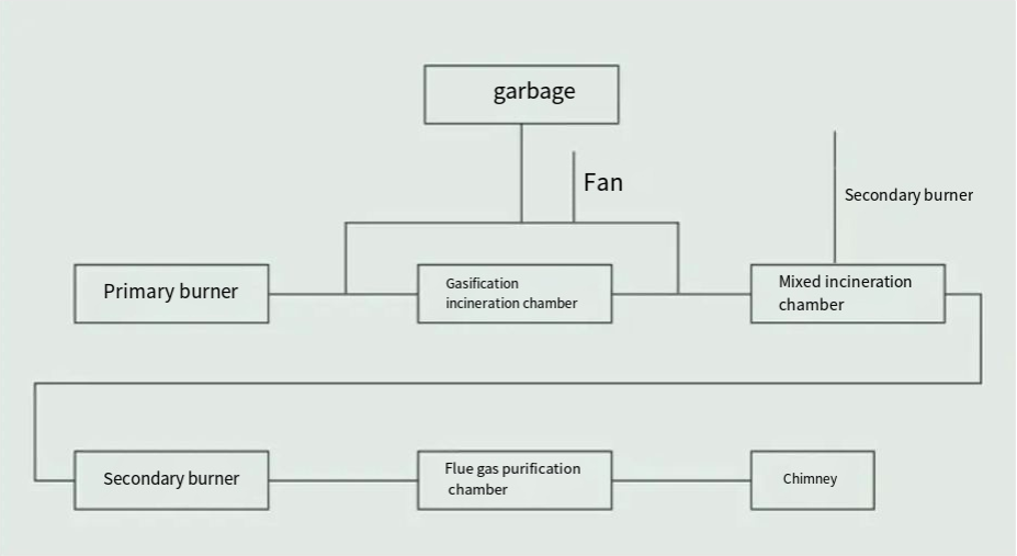 Postupak izgaranja: Otpad ulazi u komoru za izgaranje radi spaljivanja. Unutar je postavljena zona izgaranja, a mali dio komore za izgaranje posvećen je procesu sagorijevanja. Ovdje otpad dolazi u kontakt s grijanim zrakom, zapaljen strojem za izgaranje pod kontrolom temperature. Pridržavajući se načela tri T temperature, vremena i turbulencije, otpad je podvrgnut potpunoj oksidaciji, pirolizi i izgaranju unutar tijela peći. Rezultirajući dimni plin tada ulazi u sekundarnu komoru za izgaranje, gdje se podvrgava izgaranju visoke temperature. Dimni plin podvrgnut je temperaturama većim od 850 ° C najmanje 2 sekunde, što osigurava potpunu spaljivanje štetnih plinova i temeljito raspadanje štetnih patogena. Organska tvar u otpadnim izgaranju, stvarajući toplinu i oslobađanje ugljičnog dioksida i vodene pare.